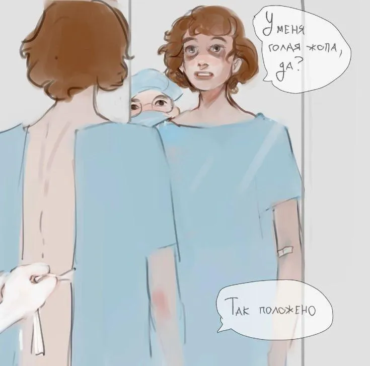 Увидела этот арт (насколько я поняла, автор Саша Скляр) и почему-то представился Разумовский, которому даже в больнице неловко ходить в таком виде.
